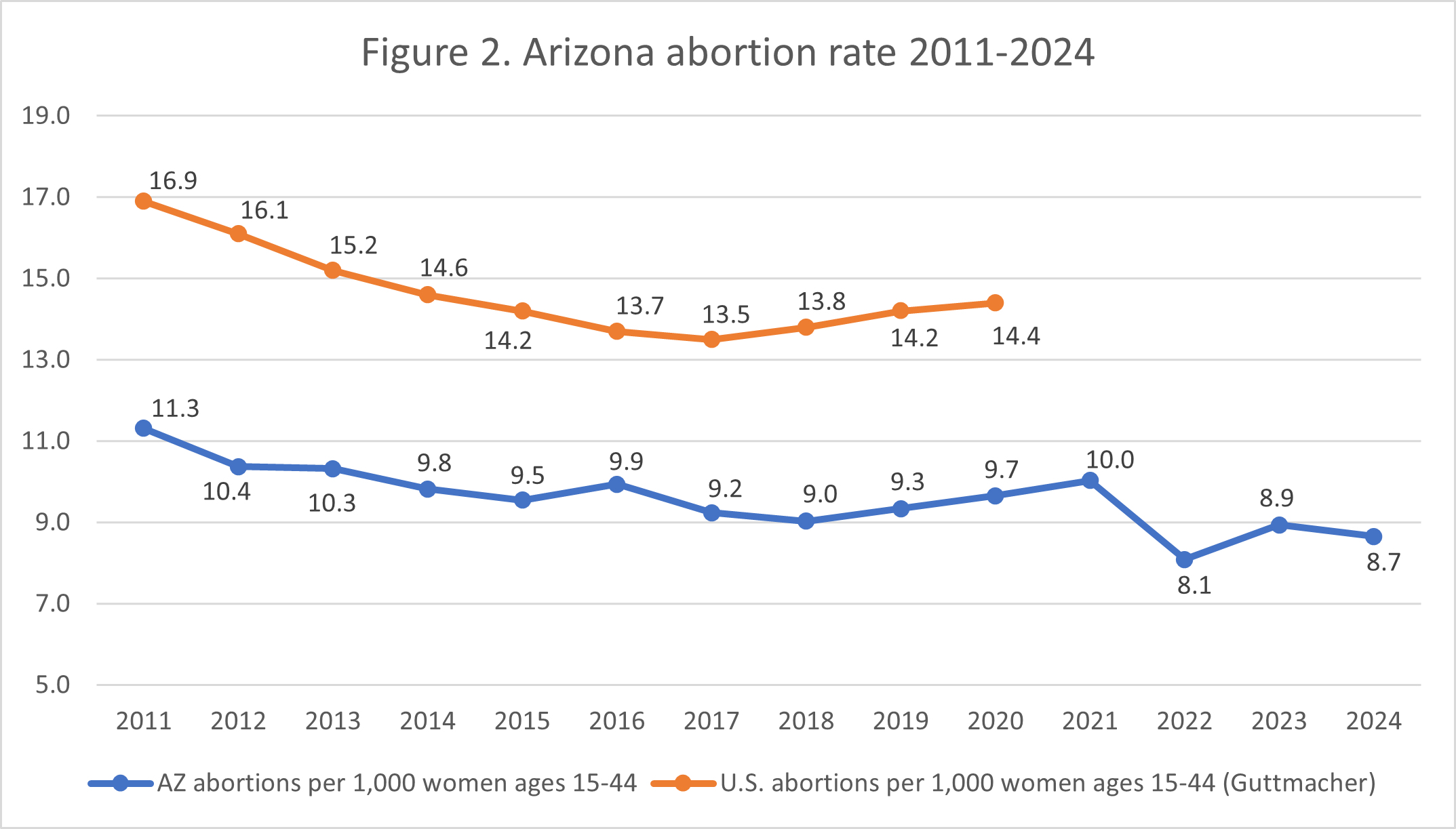 - National rates were calculated by the Guttmacher Institute. Arizona rates were calculated by CLI using the following formula: (total number of abortions performed in Arizona Ă· number of resident women ages 15-44 [based on most recent population estimates]) x 1,000. Rates may differ slightly from previous CLI articles due to revised population estimates. Population estimates were obtained from the CDC WONDER database. Estimates for 2005-2009 are intercensal estimates of the July 1 resident population. Estimates for 2010-2019 are Vintage 2020 postcensal estimates of the July 1 resident population. Estimates for 2020-2024 are Vintage 2024 postcensal estimates of the July 1 resident population. Estimates were produced by the U.S. Census Bureau and the National Center for Health Statistics.