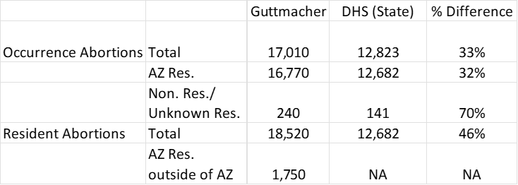 When looking at the totals estimated by Guttmacher and those reported by the state, one can see a large discrepancy between the totals. To see those discrepancies further highlighted, see the following table: