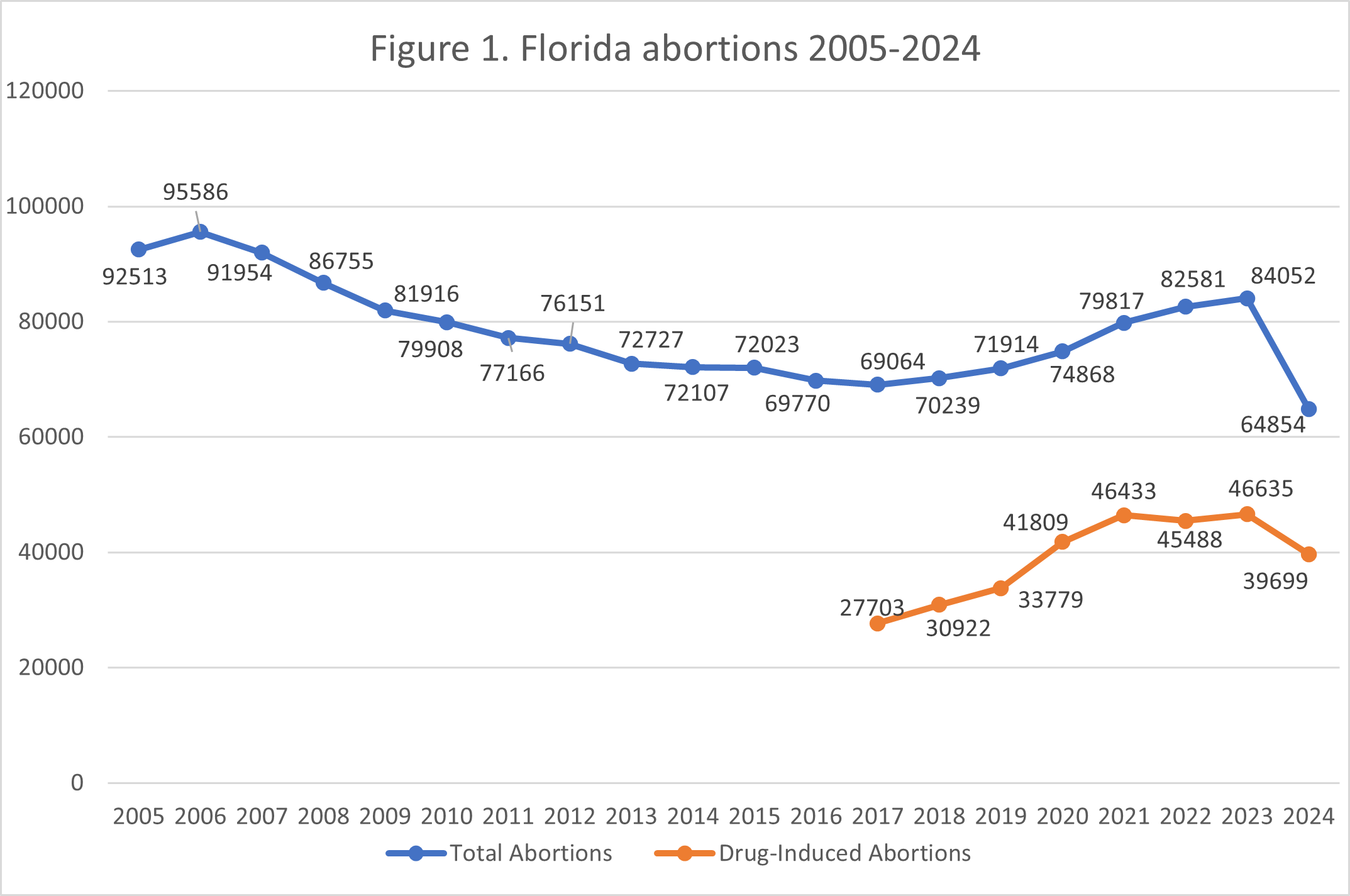 Florida publishes some of its abortion reporting tables on the state’s Agency for Health Care Administration (ACHA) website. The full report was provided to the Charlotte Lozier Institute (CLI) in August 2025, following a request made in February 2025. The data provided to CLI showed that brick-and-mortar abortions reported in the state decreased significantly from 2023 to 2024.