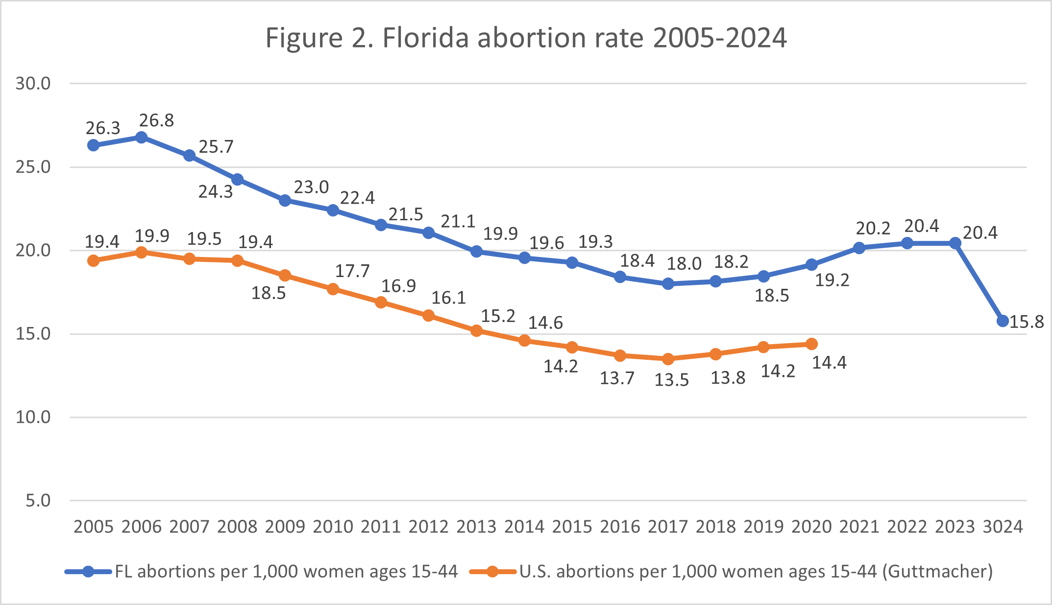- National rates were calculated by the Guttmacher Institute. Florida rates were calculated by CLI using the following formula: (total number of abortions performed in Florida ÷ number of resident women ages 15-44 [based on most recent population estimates]) x 1,000. Rates may differ slightly from previous CLI articles due to revised population estimates. Population estimates were obtained from the CDC WONDER database. Estimates for 2005-2009 are intercensal estimates of the July 1 resident population. Estimates for 2010-2019 are Vintage 2020 postcensal estimates of the July 1 resident population. Estimates for 2020-2024 are Vintage 2023 postcensal estimates of the July 1 resident population. Estimates were produced by the U.S. Census Bureau and the National Center for Health Statistics. Rates for 2024 were calculated using the Vintage 2023 postcensal estimates because 2024 population estimates have not yet been released by the CDC.