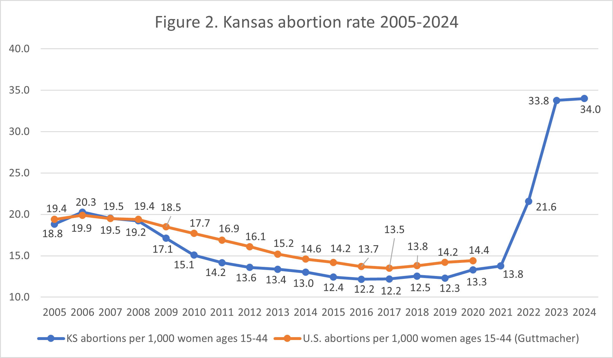 - National rates were calculated by Guttmacher Institute. Kansas rates were calculated by CLI using the following formula: (total number of abortions performed in Kansas Ă· number of resident women ages 15-44 [based on most recent population estimates]) x 1,000. Rates may differ slightly from previous CLI articles due to revised population estimates. Population estimates were obtained using the CDC WONDER database. Estimates for 2005-2009 are intercensal estimates of the July 1 resident population. Estimates for 2010-2019 are Vintage 2020 postcensal estimates of the July 1 resident population. Estimates for 2020-2024 are Vintage 2024 postcensal estimates of the July 1 resident population. Estimates were produced by the U.S. Census Bureau and the National Center for Health Statistics.