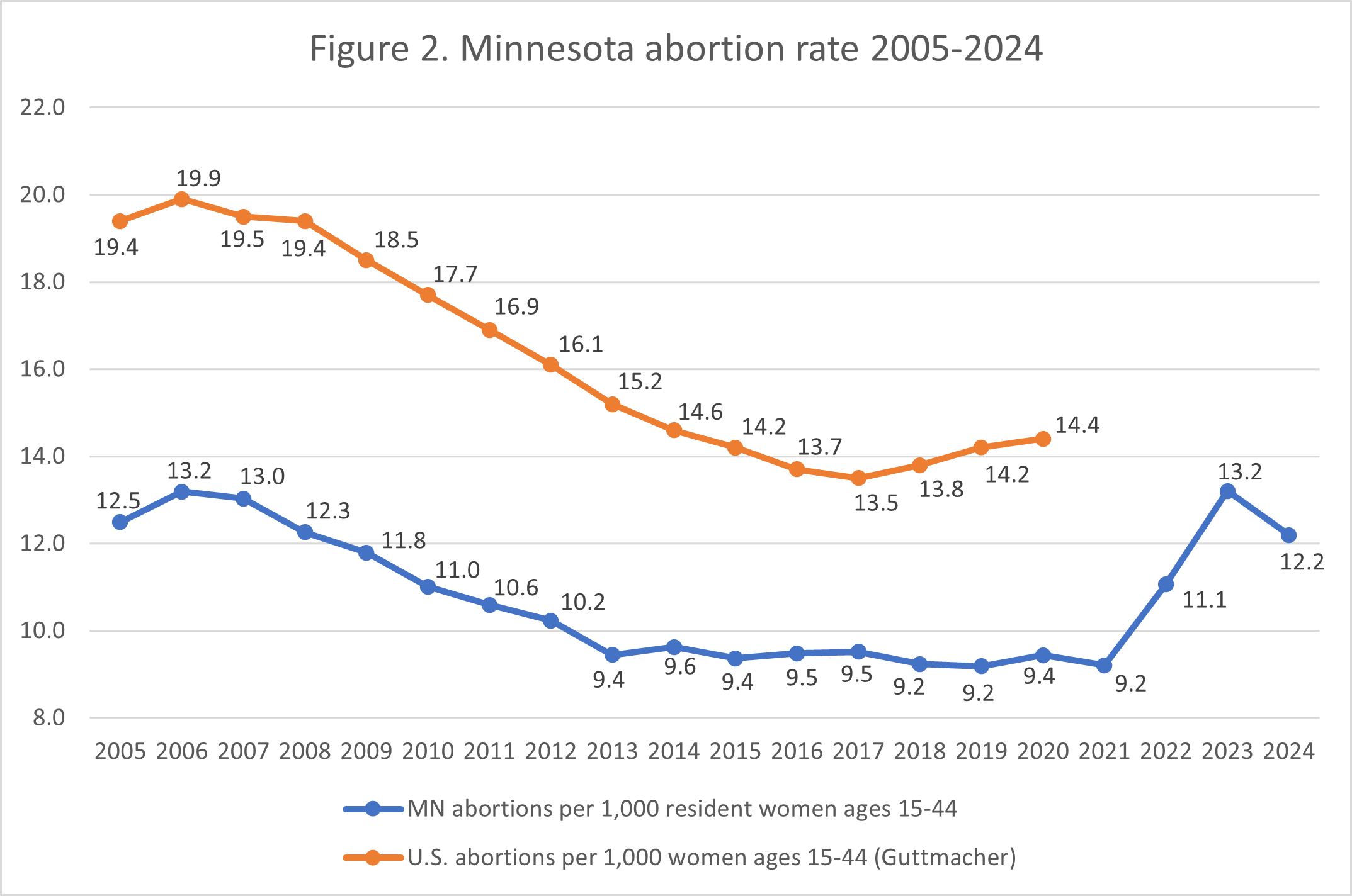 1. National rates were calculated by Guttmacher Institute. Minnesota rates were calculated by CLI using the following formula: (total number of abortions performed in Minnesota ÷ number of resident women ages 15-44 [based on most recent population estimates]) x 1,000. Rates may differ slightly from previous CLI articles due to revised population estimates. Population estimates were obtained using the CDC WONDER database. Estimates for 2005-2009 are intercensal estimates of the July 1 resident population. Estimates for 2010-2019 are Vintage 2020 postcensal estimates of the July 1 resident population. Estimates for 2020-2024 are Vintage 2024 postcensal estimates of the July 1 resident population. Estimates were produced by the U.S. Census Bureau and the National Center for Health Statistics.