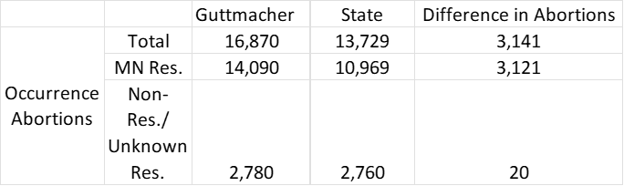 As one can see, the difference in the state’s reported total and Guttmacher’s estimated total does not come primarily from differing nonresident counts. The difference in totals as reported by the state and estimated by Guttmacher, as displayed below, comes almost entirely from the reported totals of state resident abortions occurring in the state.