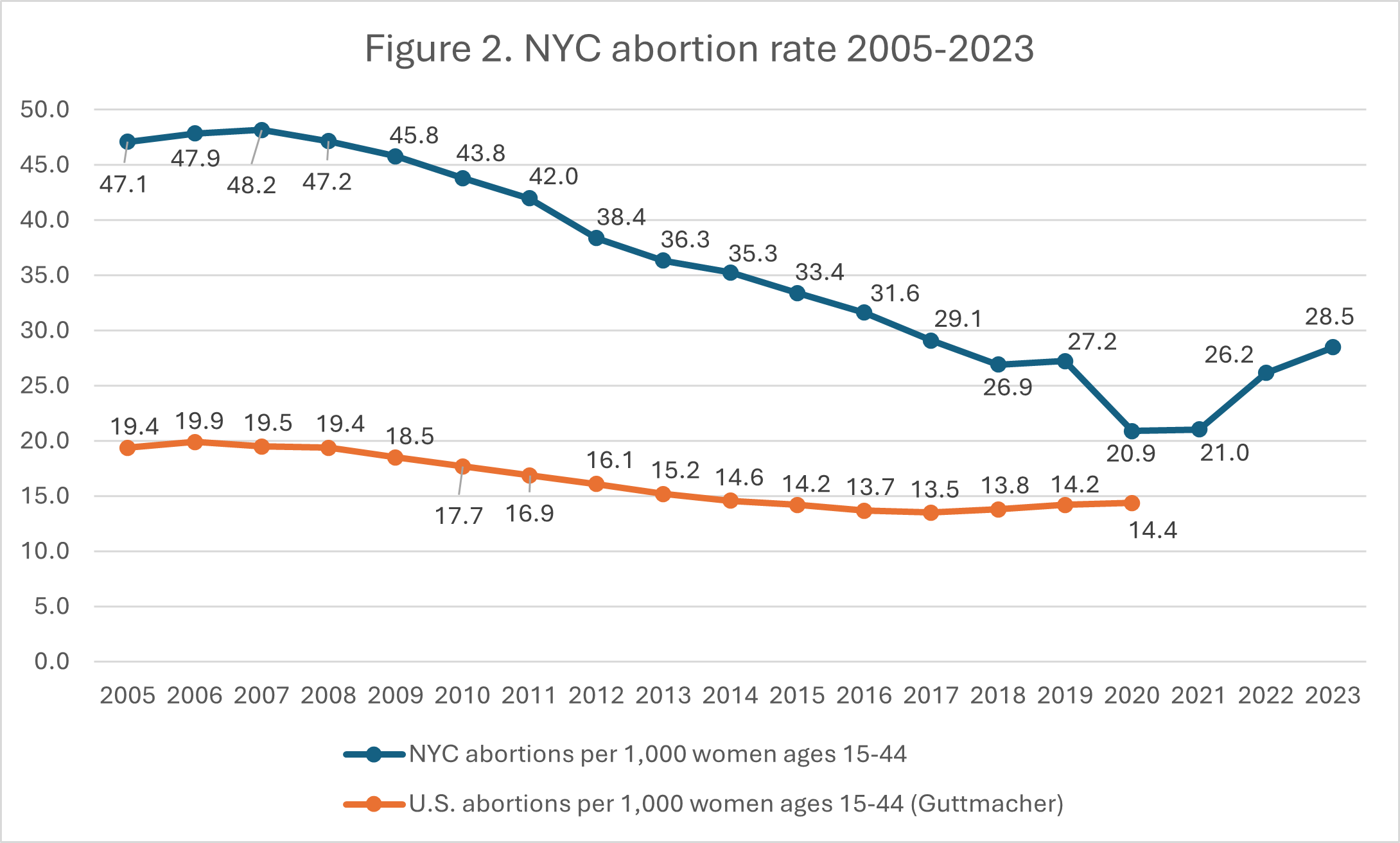 - National rates were calculated by the Guttmacher Institute. New York City rates were calculated by CLI using the following formula: (total number of abortions performed in New York City ÷ number of resident women ages 15-44) x 1,000. Rates may differ slightly from previous CLI articles due to revised population estimates. Population estimates were obtained from CDC WONDER. Estimates for 2005-2009 are intercensal estimates of the July 1 resident population. Estimates for 2010-2020 are Vintage 2020 postcensal estimates of the July 1 resident population. Estimates were produced by the U.S. Census Bureau and the National Center for Health Statistics. 2022 and 2023 population estimates were calculated using totals from Table PC2, “Population Estimates by Age, Mutually Exclusive Race and Hispanic/Latino Origin, and Sex, New York City, 2023,” within New York City’s 2023 vital statistics summary.